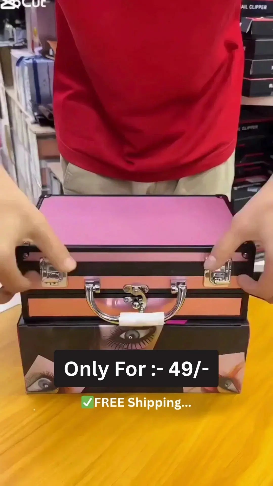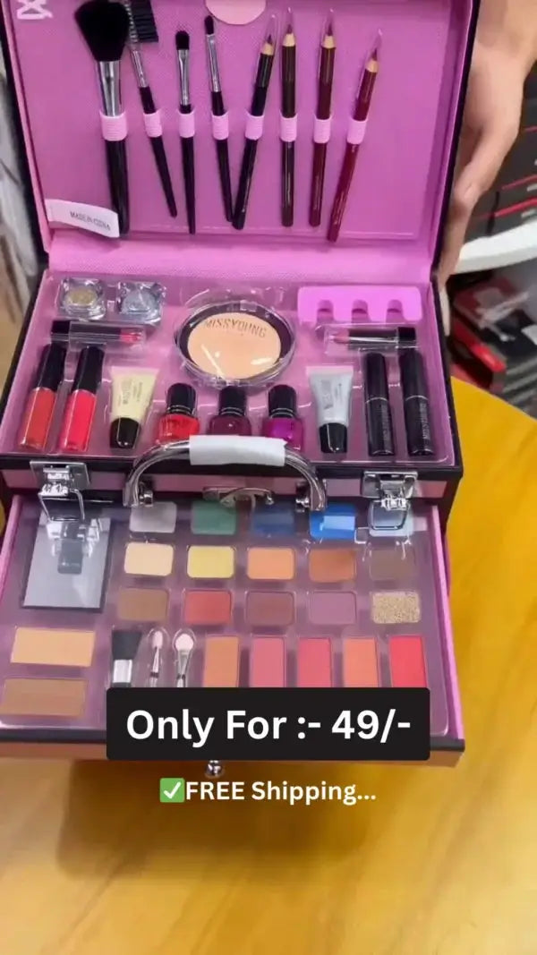 This all-in-one makeup kit box includes eyeshadows,lipsticks,nail paints,blushers,foundation,kajal,eyeliners,brushes,and essential beauty tools,offering everything needed for a full glam look.