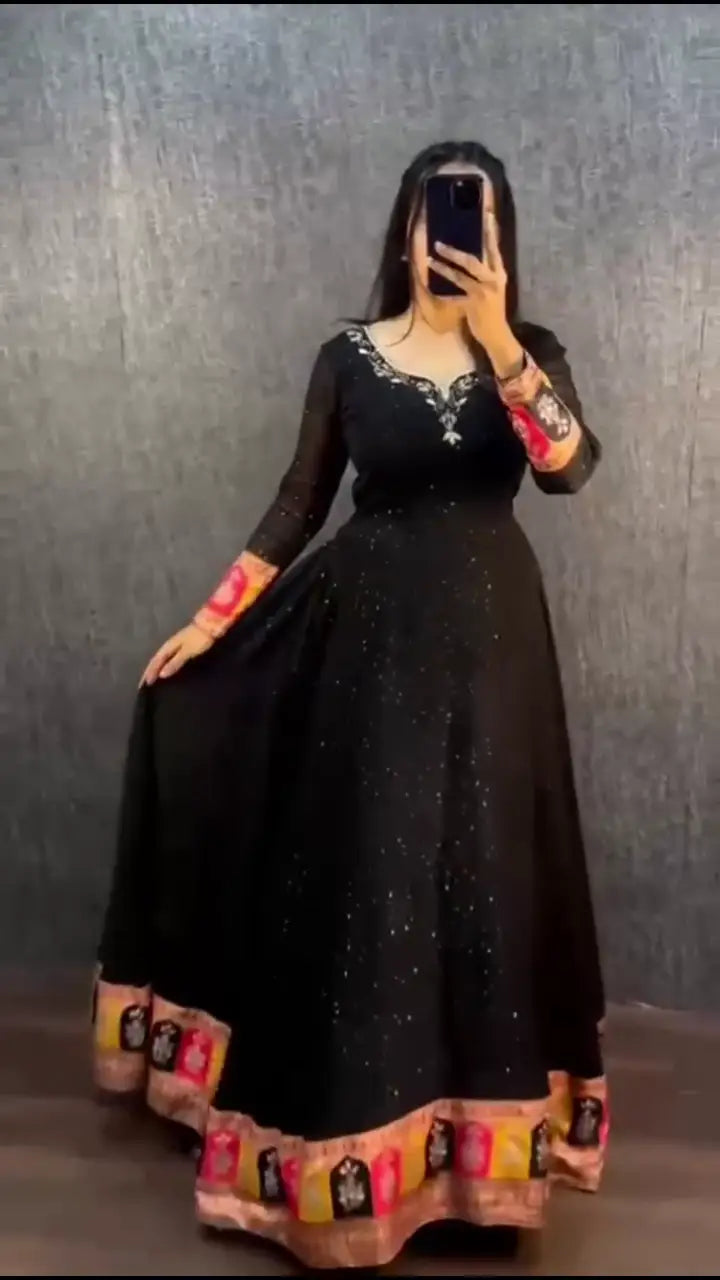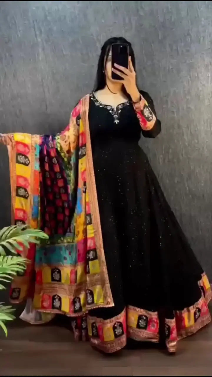 Whether attending weddings,festive gatherings,or formal celebrations,this black Anarkali gown guarantees a standout presence with timeless charm and sophistication.