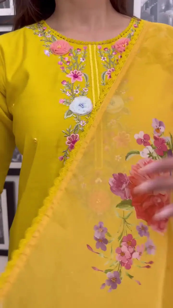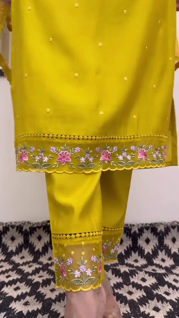 Bring radiance and elegance to your festive wardrobe with this Bright Yellow 3-Piece Embroidered Suit Set, beautifully designed for daytime celebrations and traditional gatherings. The kurta features intricate floral thread embroidery along the neckline and sleeves, striking a balance between delicacy and detail. The look is enhanced by a sheer organza dupatta adorned with digital floral prints and subtle embellishments. Coordinated trousers with embroidered cuffs complete this vibrant ensemble, making it a perfect choice for occasions that call for grace, color, and craftsmanship.