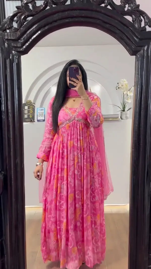 Crafted from soft georgette fabric, this Anarkali suit set offers a lightweight yet durable construction. The fabric drapes gracefully, creating a flowing silhouette that enhances elegance while ensuring all-day comfort.