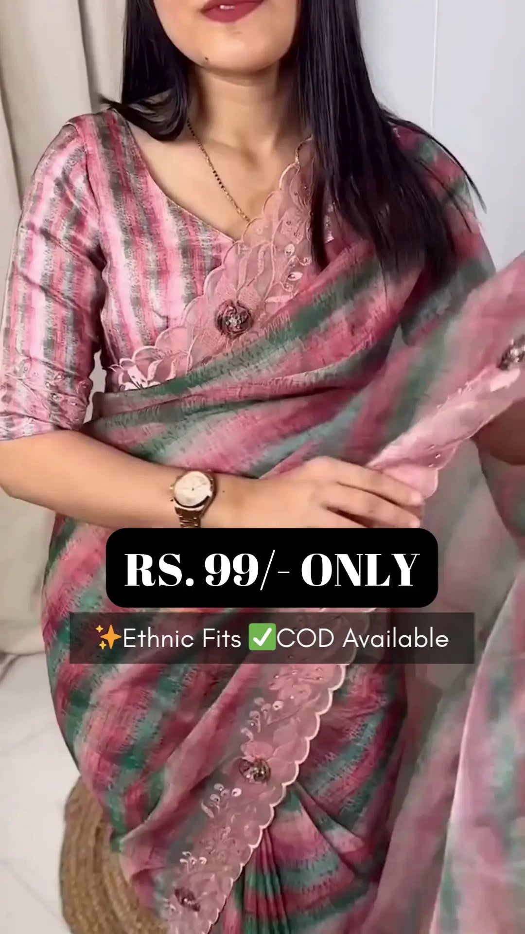 This saree showcases elegant stripes that bring a refined charm, offering a look that is both modern and timeless. The flowing drape enhances its sophistication with every movement.